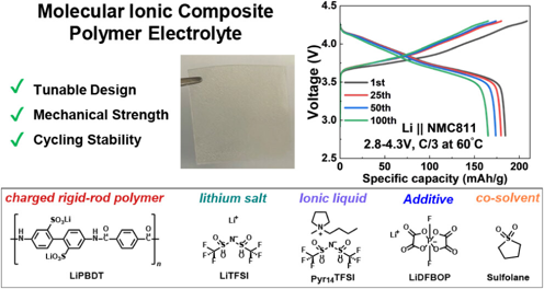 隨著新能源汽車和儲能技術(shù)對高能量密度電池的需求日益迫切,高壓層狀氧化物正極(如 NMC811)與金屬鋰負極的組合成為研究熱點。然而,傳統(tǒng)聚合物電解質(zhì)在高壓下易發(fā)生分解,導致界面副反應和鋰枝晶生長,嚴重影響電池循環(huán)壽命和安全性。弗吉尼亞理工大學化學系 Feng Lin 教授團隊提出的 MIC 電解質(zhì)體系,通過剛性棒狀離子聚合物 PBDT 與離子液體、鋰鹽及功能添加劑的協(xié)同作用,構(gòu)建了具有優(yōu)異機械強度和電化學穩(wěn)定性的一體化電解質(zhì)膜。