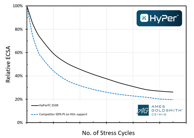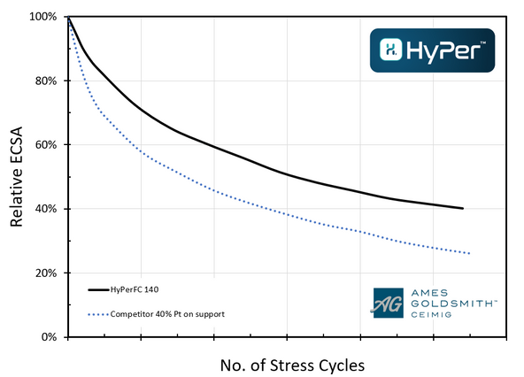 HyPerTM FC 150X(50%鉑在超高表面積載體上)與具有更高電化學(xué)表面積的類似商業(yè)級(jí)產(chǎn)品的比較,改進(jìn)后的電化學(xué)性能具有更高的耐用性。