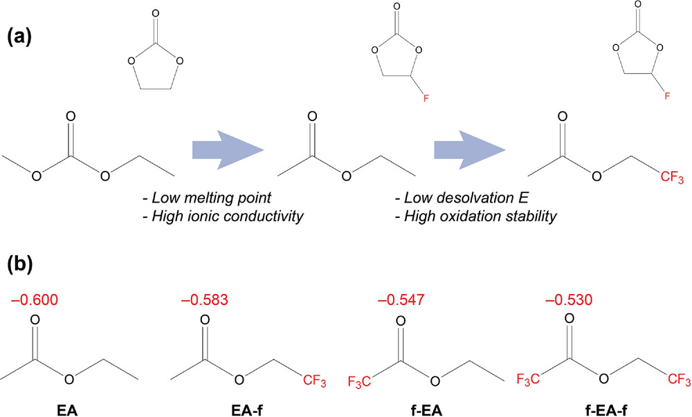 a) 溶劑設(shè)計從碳酸鹽到氟化酯的過渡方案。b) EA、EA-f、f-EA 和 f-EA-f 中羰基的原子電荷分析。